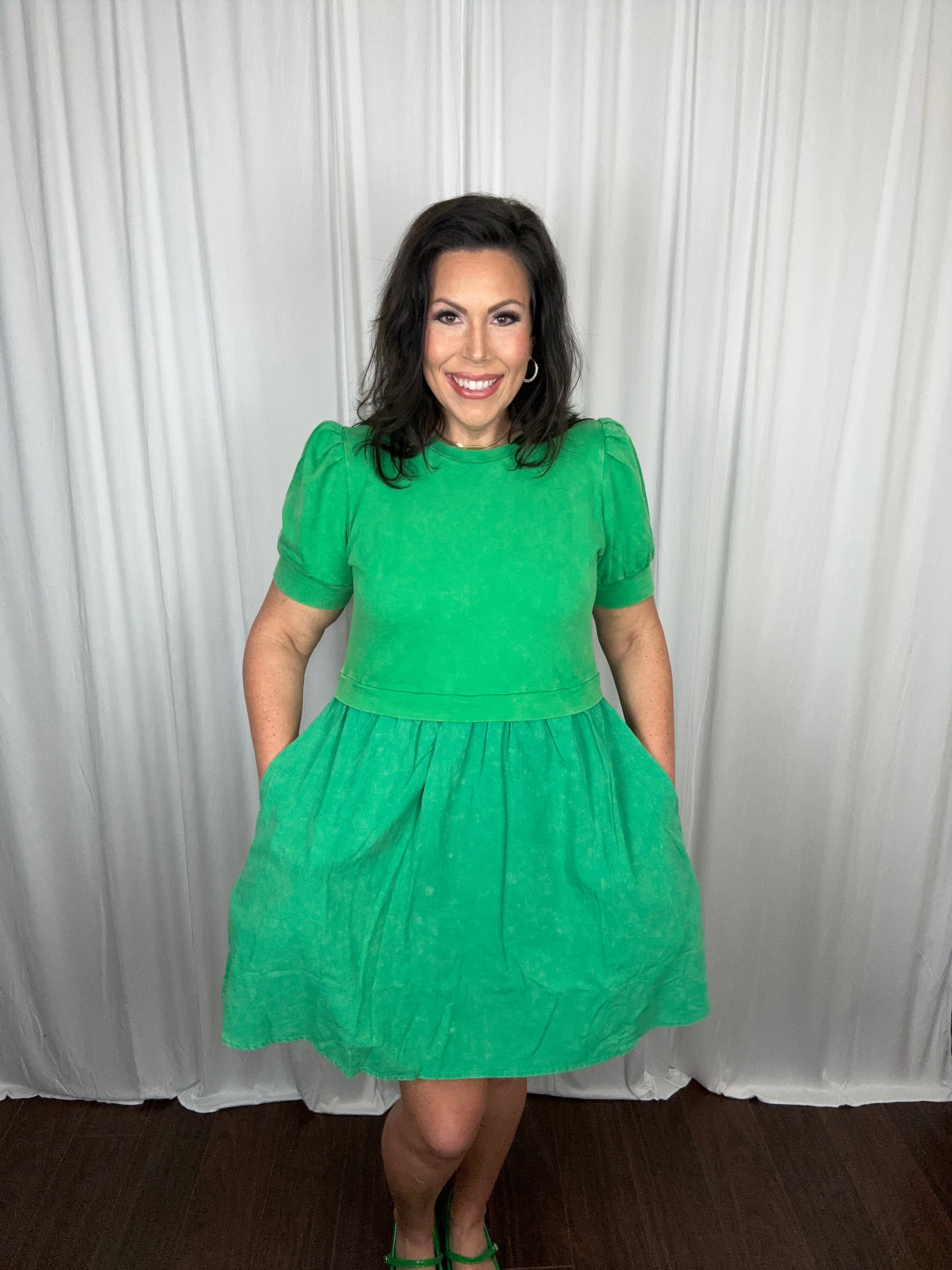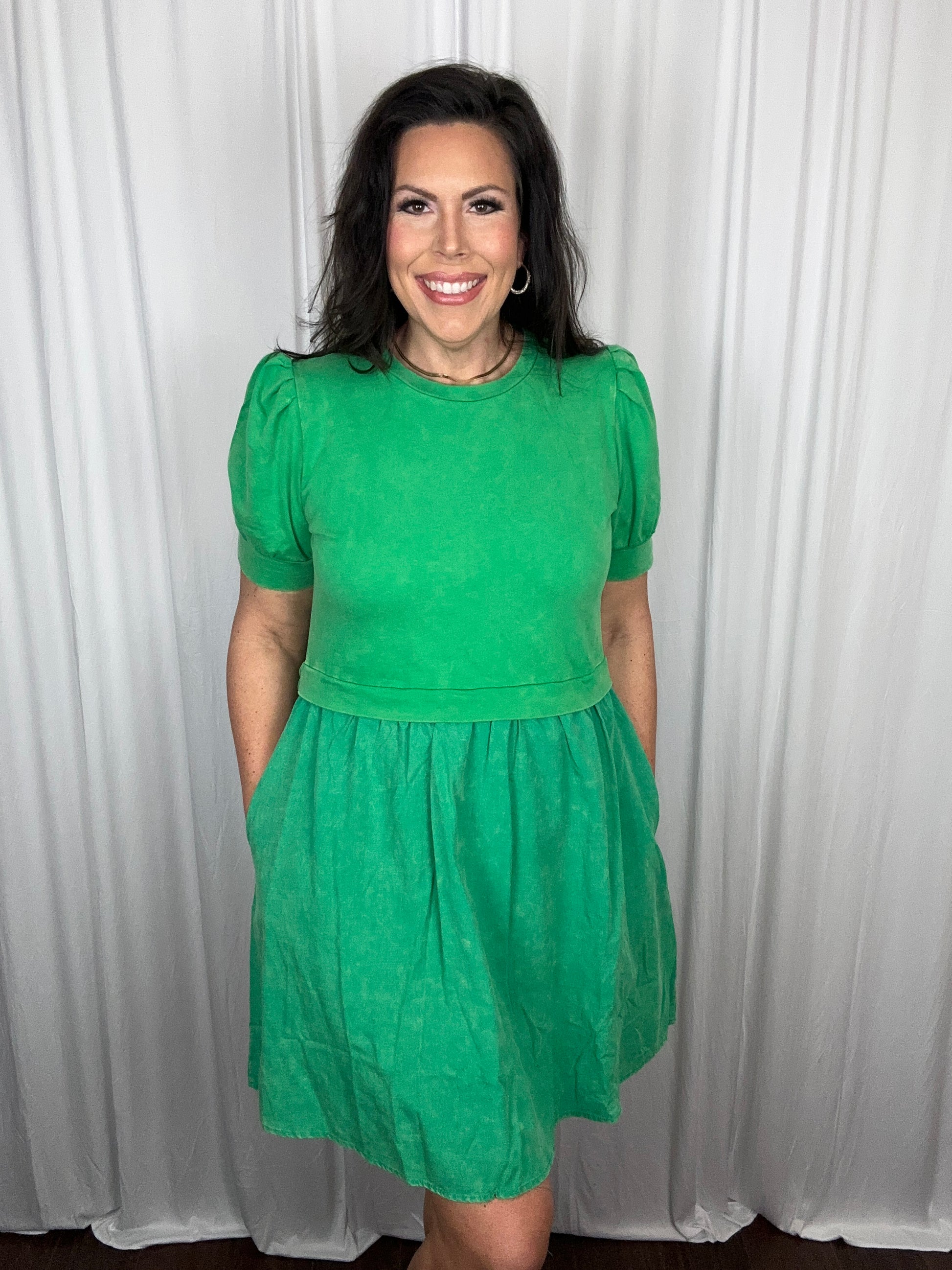 Acid washed cotton dress with U-neck, side pockets, short puffed sleeves, band cuffs, and circle skirt.