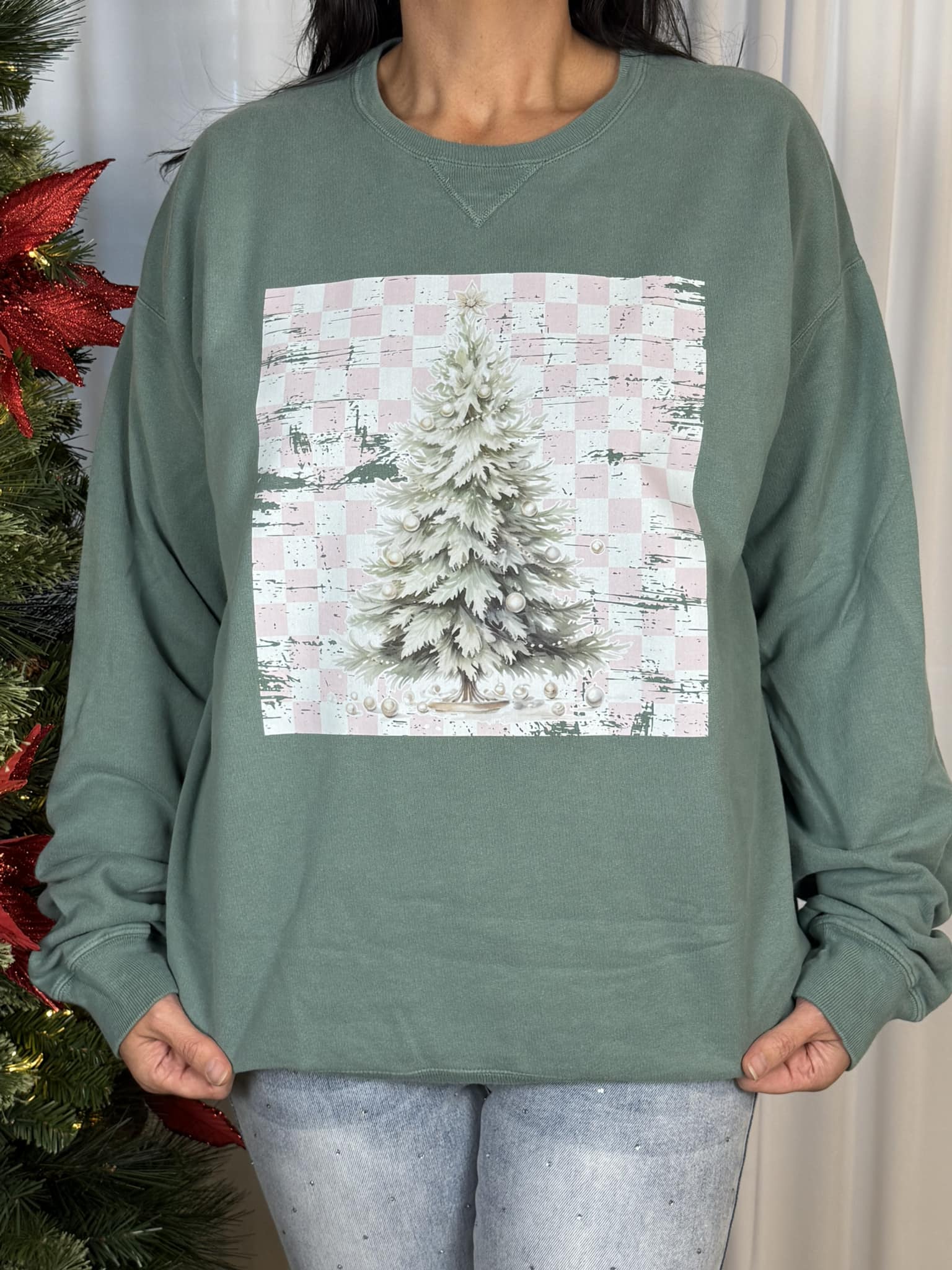Stay cozy and festive this holiday season with our Christmas tree sweatshirt. Made with 100% cotton, this holiday fashion essential features a festive Christmas tree design with a checkered background. Perfect for staying warm and stylish during the holidays.
