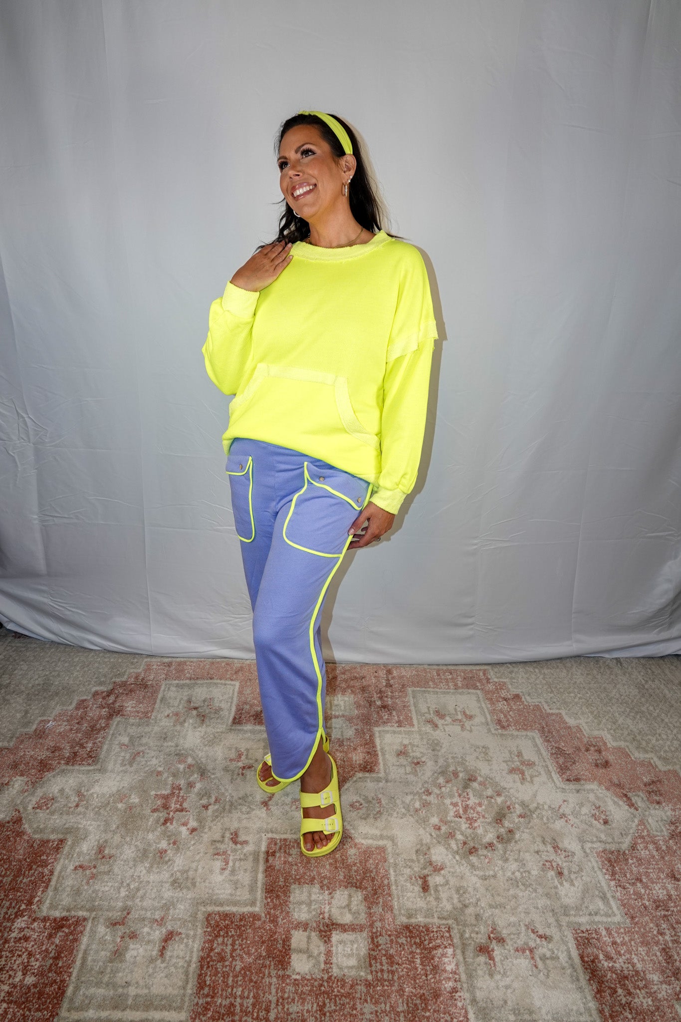 Cropped sweatpants with vibrant neon yellow trim deliver a bold, contemporary edge to your casual wardrobe. The shortened silhouette pairs effortlessly with sneakers or slides, while the striking accent detailing elevates basic loungewear into statement-worthy pieces. Perfect for athleisure styling or relaxed weekend wear, these pants balance comfort with modern flair. The neon trim catches light and adds visual interest, making them a versatile layering piece that works across multiple outfits.