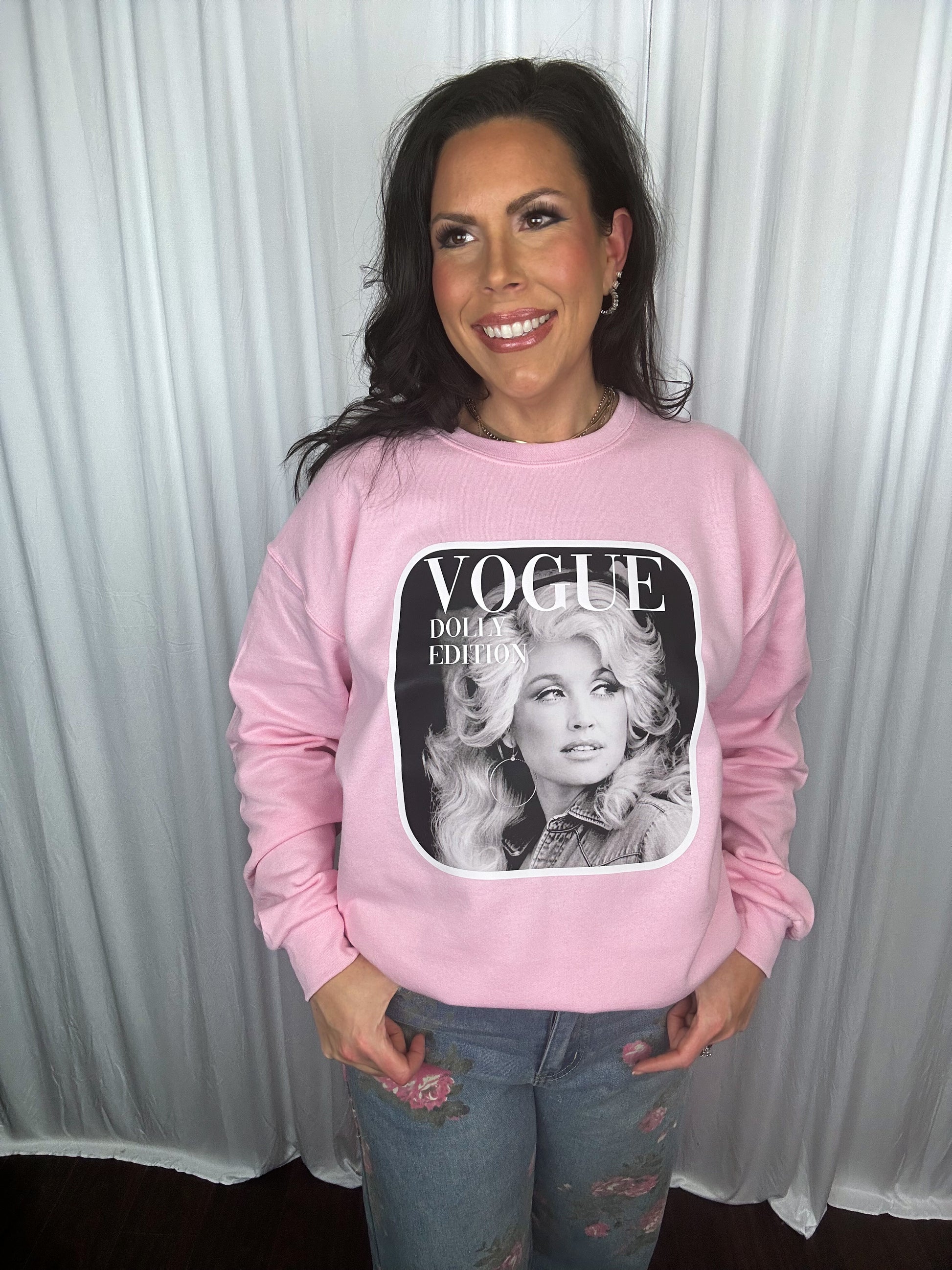 This Pink Dolly Vogue Edition Sweatshirt is a fun and unique addition to any wardrobe. Made on a Jerzee Nublend Sweatshirt, it features a vintage Dolly photo on the Cover of Vogue magazine. Show off your fashion expertise and stay cozy in style.