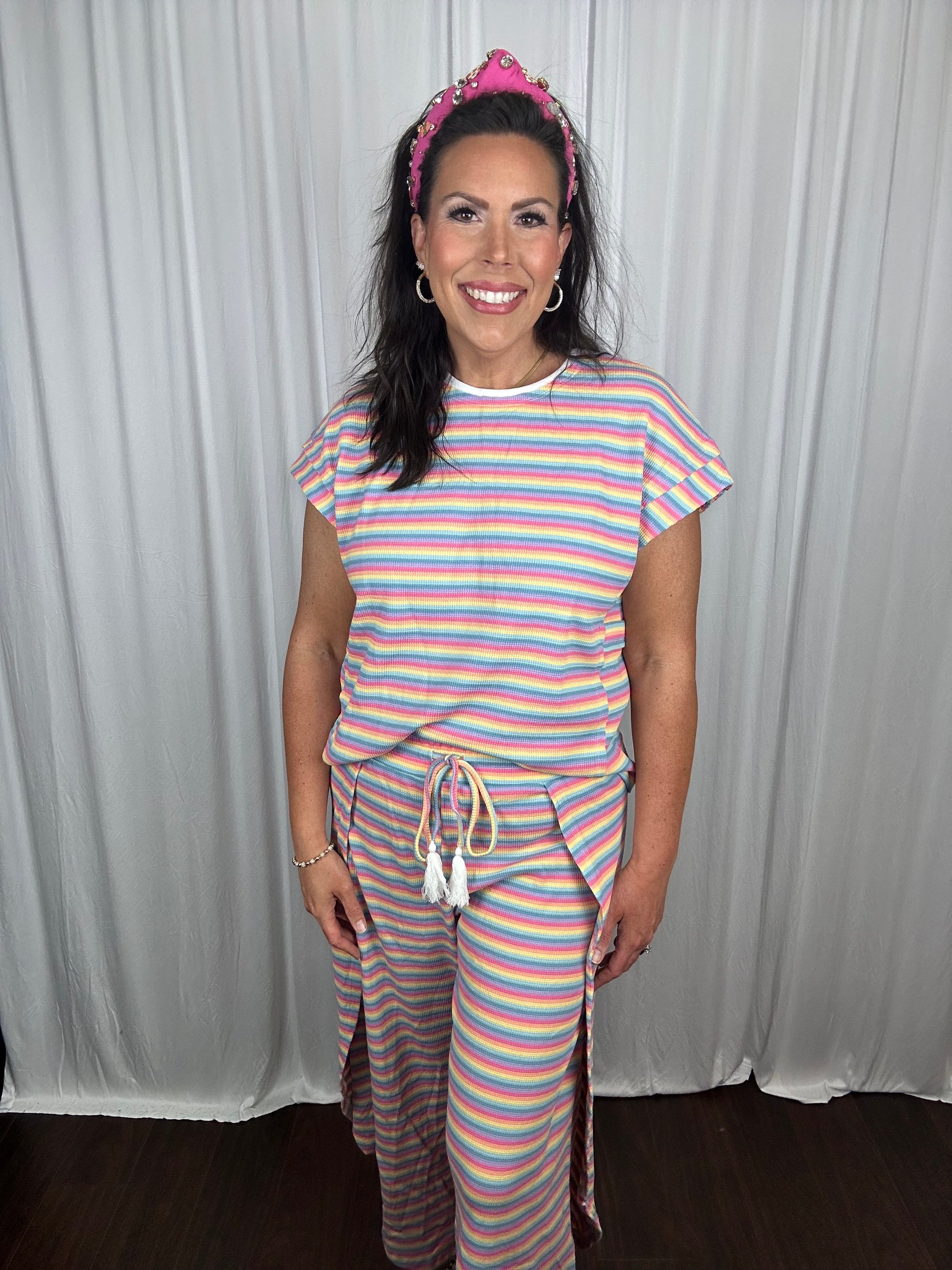 Style fashionably and comfortably in this casual 2pcs outfit Including a boxy fit top and a pair of drawstring wide leg pants There are unique designs of tassel string and flap slit for the pants Pair it with some cute sandals or sneakers for a effortlessly laid-back vibe